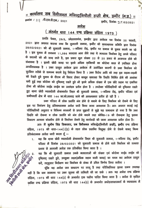 • INDORE : गुजराती समाज के चुनाव पर प्रशासन ने लगाया प्रतिबंध