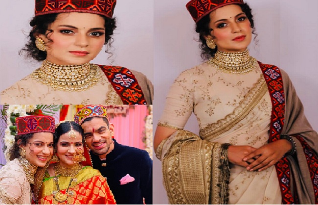 बॉलीवुड अभिनेत्री कंगना रनौत इन दिनों सोशल मीडिया पर काफी सक्रिय हैं। अभिनेत्री कंगना रनौत इन दिनों अपने ट्रेडिशनल लुक की वजह से चर्चा में हैं। हाल में कंगना के भाई अक्षत की शादी हुई है। बॉलीवुड की ‘क्वीन’ कंगना रनौत ने पिछले दिनों अपने भाई की शादी की तस्वीरें सोशल मीडिया पर शेयर की थी। शादी के बाद अब अक्षत का रिसेप्शन हुआ है जिसकी तीन तस्वीरें कंगना रनौत ने रविवार को ट्विटर पर शेयर की है। इन तस्वीरों में कंगना रनौत ट्रेडिशनल ड्रेस में दिखाई दे रही हैं। कंगना रनौत ने गोल्डन प्रिंटेड साड़ी के साथ मैचिक जूलरी पहनी हैं। इसके अलावा कंगना ने ट्रडिशनल पहाड़ी शॉल और टोपी भी पहनी हुई है। कंगना रनौत ने ट्विटर प तस्वीरें शेयर कर लिखा-‘आज अक्षत और रितु की शादी के धाम (रिसेप्शन) के लिए ट्रेडिशनल पहाड़ी कपड़े पहनी।’