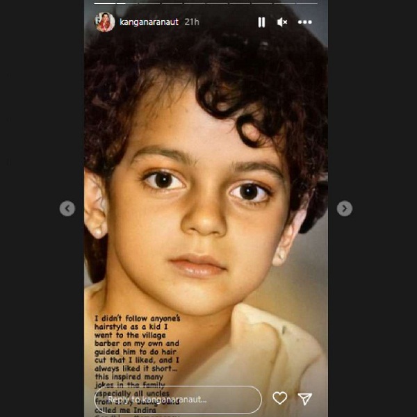 वहीं, कंगना ने बचपन की अपनी दूसरी तस्वीर के कैप्शन में लिखा-‘ मैंने बचपन में भी किसी का हेयरस्टाइल फॉलो नहीं किया। मैं गांव के बार्बर के पास जाती थी और जो हेयरकट मुझे पसंद आता था मैं करवा लेती थी। मुझे हमेशा छोटे बाल पसंद आते थे। जिस कारण मेरे कई अंकल मुझे इंदिरा गांधी बुलाते थे।’