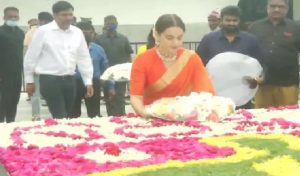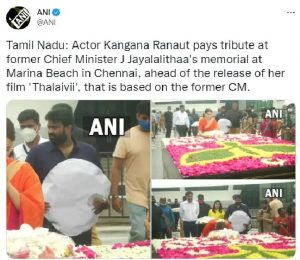 कंगना रनौत अपनी फिल्म ‘थलाइवी’ के रिलीज से पहले तमिलनाडु में चेन्नई के मरीना बीच पर बने जे जयललिता मेमोरियल पर पहुंचीं. वहां पहुंच कर एक्ट्रेस ने पूर्व मुख्यमंत्री जयललिता के स्मारक पर श्रद्धांजलि अर्पित की. एक्ट्रेस ऑरेज और गोल्डेन कलर की साड़ी पहने नजर आईं.