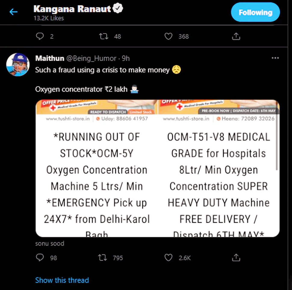 यूजर ने ट्वीट में लिखा, ‘ये ऐसा फ्रॉड आदमी है कि इस क्राइसिस के वक्त को 2 लाख के ऑक्सीजन कंसंट्रेटर का विज्ञापन करके पैसा बनाने में इस्तेमाल कर रहा है.’ बॉलीवुड एक्ट्रेस कंगना रनौत (Kangana Ranaut) समेत हजारों लोगों ने इस ट्वीट को लाइक किया है. इस ट्वीट को सैकड़ों लोगों द्वारा रीट्वीट किया गया है. मालूम हो कि सोनू सूद (Sonu Sood) कोरोना काल में अब तक लाखों लोगों की मदद कर चुके हैं.