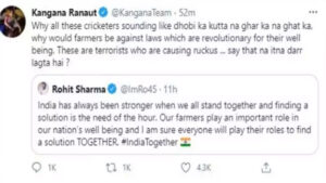 कंगना रनौत का ‘अपमानजनक’ ट्वीट : किसान आंदोलन (Farmers Protest) पर सभी क्रिकेटर्स अपना पक्ष रख रहे हैं। विराट कोहली, सचिन और रहाणे जैसे बड़े-बड़े खिलाड़ियों ने देश को मैसेज दिया है। रोहित शर्मा ने भी इस पर ट्वीट किया। जिसके बाद कंगना रनौत ने उनके ट्वीट को रिट्वीट कर सभी क्रिकेटर्स पर निशाना साधा।