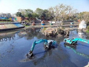 इंदौर। पिछले कुछ दिनों से कान्ह नदी में जमा गाद और कचरा निकालने के लिए नगर निगम का अमला आज से सक्रिय हो गया है। कृष्णपुरा और शिवाजी मार्केट के हिस्से में नदी की सफाई के लिए आधा दर्जन पोकलेन बुलवाई गईं, वहीं दूसरी ओर निगम टीमें भी किनारों से कचरा निकालने में जुटी थीं।
