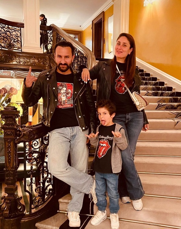 वहीं दूसरी तस्वीर में सैफ, करीना और तैमूर सीढ़ियों में खड़े होकर स्टाइलिश लुक में पोज दे रहे हैं। दरअसल तीनों ने लंदन के फेमस म्यूजकि कॉन्सर्ट के लिये सैफ, करीना और तैमूर तीनों ने ही ब्लैक आउटफिट कैरी किया था। तीनों ने ही द रोलिंग स्टोन्स के लोगो वाली ब्लैक टी-शर्ट पहनी हुई थी। एक ओर जहां करीना और सैफ टी-शर्ट पर ब्लैक कलर की लेदर जैकेट पहने हुए थे। वहीं कूल तैमूर ने ग्रे कलर की हुडी डाली हुए नजर आ रहे हैं।