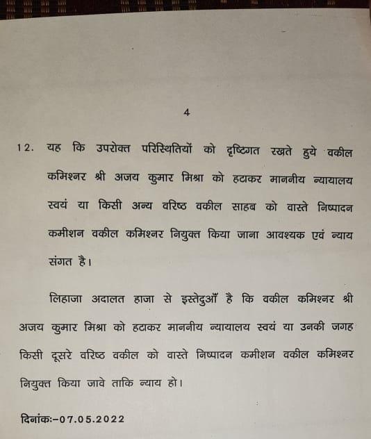 प्रार्थना पत्र में मांग की गई कि कोर्ट कमिश्नर अजय कुमार मिश्रा को हटाकर माननीय न्यायालय स्वयं या उनकी जगह किसी दूसरे वरिष्ठ वकील को वकील कमिश्नर नियुक्त करे, ताकि निष्पक्ष न्याय हो. इस मामले में कोर्ट ने सुनवाई का समय 2 बजे तय किया है.
