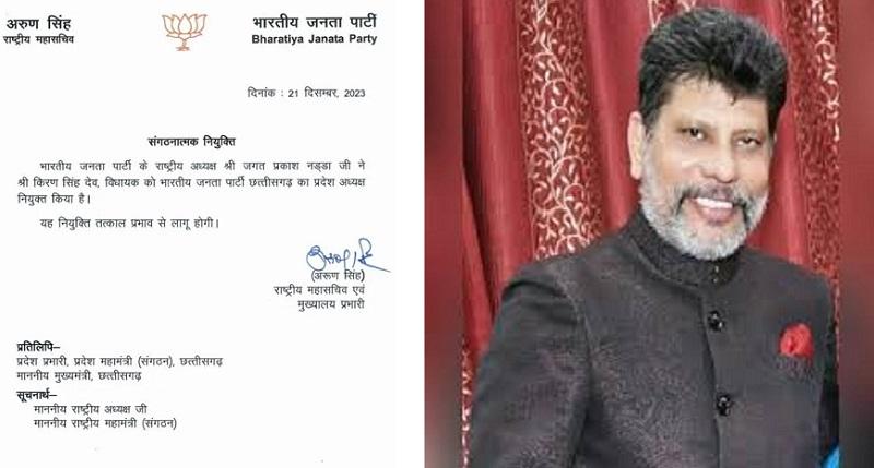 बता दें कि किरण सिंह देव छत्तीसगढ़ के जगदलपुर से पहली बार विधायक निर्वाचित हुए हैं। पार्टी की ओर से जारी एक आधिकारिक विज्ञप्ति में बृहस्पतिवार को यह जानकारी दी गई। इसके मुताबिक सिंह की नियुक्ति तत्काल प्रभाव से लागू होगी। सिंह, हाल ही में राज्य सरकार में उपमुख्यमंत्री बनाए गए अरुण साव की जगह लेंगे।