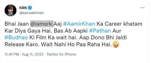 केआरके ने अपने ऑफिशियल ट्विटर हैंडल पर पोस्ट शेयर की है. उन्होंने अपनी एक पोस्ट में आमिर खान का करियर खत्म होने का दावा किया है. इसके साथ ही केआरके ने शाहरुख खान को भी चेतावनी दी है. आमिर खान की लाल सिंह चड्ढा के खराब बिजनेस के बाद केआरके ने सलमान और शाहरुख से उनकी फिल्में जल्दी रिलीज करने की बात कही है.