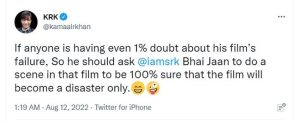केआरके ने अपने ट्वीट में सलमान खान का नाम तो मेंशन नहीं किया है, लेकिन उनके लिखने के अंदाज से इतना तो साफ है कि उन्होंने अपने ट्वीट में सलमान की ही बात की है.