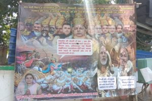पटना । बिहार के पटना में (In Patna Bihar) राजद कार्यालय के बाहर लगाए गए पोस्टर में (In the Poster outside the RJD Office) राजद प्रमुख (RJD Chief) लालू यादव (Lalu Yadav) जहां भगवान विष्णु के विराट स्वरूप में (In the Virat Form of Lord Vishnu) नजर आ रहे हैं (Is Seen), वहीं उनके पुत्र और राज्य के उपमुख्यमंत्री तेजस्वी यादव भगवान कृष्ण के रूप में मुख्यमंत्री नीतीश कुमार के सारथी बने दिख रहे हैं। नीतीश अर्जुन की भूमिका में रथ पर सवार हैं। राजद के पोस्टर में लालू प्रसाद भगवान विष्णु के विराट स्वरूप में नजर आ रहे हैं, जिसमें उनके साथ कांग्रेस के राहुल गांधी, दिल्ली के मुख्यमंत्री अरविंद केजरीवाल सहित कई दलों के नेताओं की तस्वीर है।