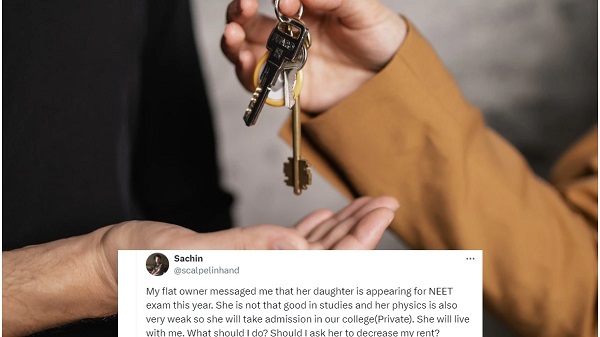 जिस पर लोग खूब प्रतिक्रिया दे रहे हैं. उसने बताया कि वो एनसीआर में तीन बेडरूम वाले फ्लैट में रहता है. उसके साथ दो अन्य पुरुष भी रहते हैं. इस बीच उसकी मकान मालकिन ने उससे कहा कि उसकी बेटी नीट परीक्षा की तैयारी कर रही है. तो उसे इसी फ्लैट का एक कमरा दे दिया जाए.