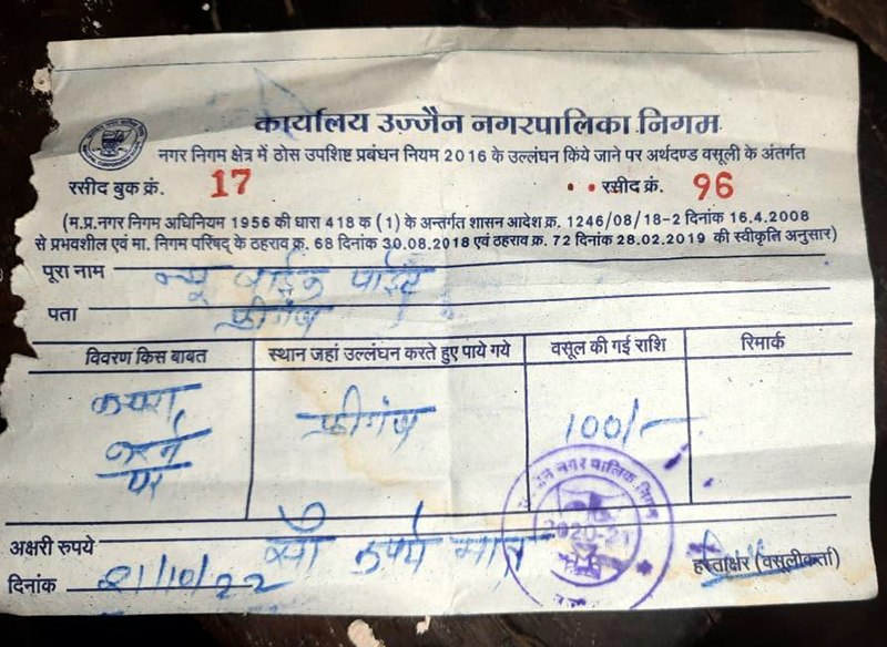 दीपावली पर्व को देखते हुए बाजारों में हजारों दुकानें लगी है। व्यवसायिक क्षेत्रों में स्वच्छता बनी रहे और ठोस अपशिष्ट प्रबंधन नियम का पालन हो सके, इसके लिए नगर निगम की टीम बाजारों में घूम रही है। कल फ्रीगंज क्षेत्र में नगर निगम की टीम ने न्यू बाईक पाइंट पर जाकर कचरा फैलाने पर 100 रुपए का जुर्माना किया और दुकानदार को रसीद बुक क्रमांक 17 व रसीद क्रमांक 96 की कार्बन कॉपी रसीद कट्टे से फाड़कर दी। रसीद पर लगी नगर निगम की मुहर पर वर्ष 2020-2021 लिखा हुआ था।