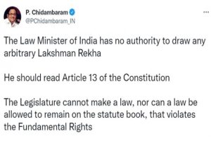 नई दिल्ली । सुप्रीम कोर्ट (Supreme Court) के देशद्रोह कानून पर (On Sedition Law) समीक्षा होने तक रोक लगाने के बाद (After Holding the Review) पूर्व केंद्रीय गृह मंत्री (Former Union Home Minister) पी. चिदंबरम (P. Chidambaram) ने ट्वीट किया, भारत के कानून मंत्री (Law Minister of India) को मनमाने ढंग से (Arbitrarily) लक्ष्मण रेखा खींचने का (To Draw Lakshman Rekha) कोई अधिकार नहीं है (Has No Right), उन्हें संविधान के अनुच्छेद 13 को पढ़ना चाहिए। चिदंबरम केंद्रीय कानून मंत्री किरण रिजिजू के लक्ष्मण रेखा वाले बयान पर निशाना साधा है।