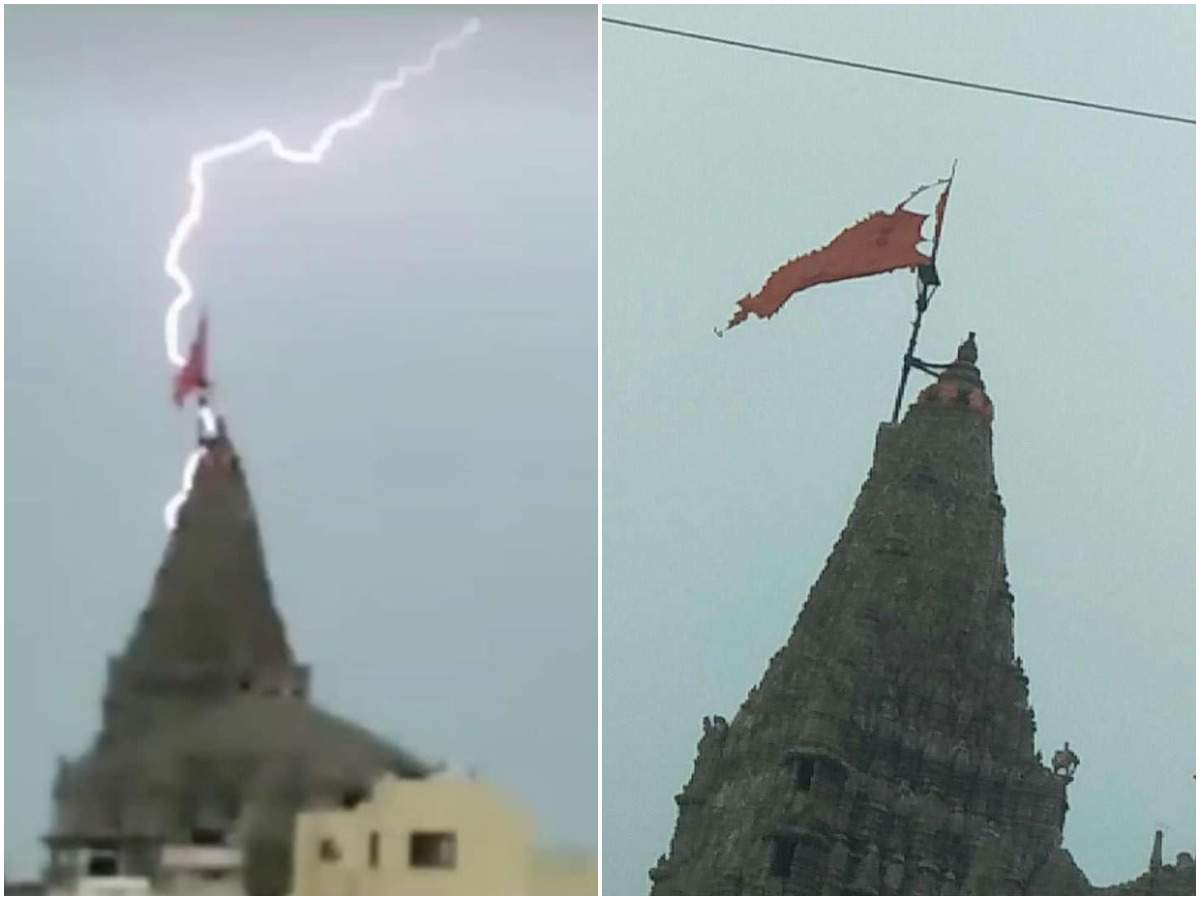 अहमदाबाद। गुजरात (Gujrat) की धार्मिक नगरी द्वारका में आसमानी बिजली गिरने (Dwarka Lighting Incident) की बड़ी घटना सामने आई है. प्राप्त जानकारी के मुताबिक द्वारका में भगवान कृष्ण के प्रसिद्ध मंदिर द्वारकाधीश (Mandir Dwarkadhish) में भारी बारिश के दौरान आसमानी बिजली गिर गई. हालांकि इस घटना में किसी व्यक्ति को कोई नुकसान नहीं पहुंचा. लेकिन इस दौरान मंदिर के शिखर पर लगी ध्वजा को नुकसान पहुंचा है. बता दें पिछले दिनों देश भर में बिजली गिरने की कई घटनाएं जिसमें कि 40 से ज्यादा लोगों की जान जा चुकी है. देश के कई हिस्सों में तेज हवाओं के साथ भारी बारिश भी देखी जा रही है.