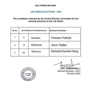 भाजपा ने ग्वालियर से भारत सिंह कुशवाह, मुरैना से शिवमंगल सिंह तोमर और खंडवा से ज्ञानेश्वर पाटिल को उम्मीदवार बनाया है. कांग्रेस इन्हें शिकस्त देने के लिए किसी मजबूत चेहरे की तलाश है. बता दें कि कांग्रेस सिर्फ 28 सीटों पर ही अपने प्रत्याशी उतार रही है. इंडिया अलाइंस के तहत एक सीट सपा को दी गई है. खजुराहो सीट पर समाजवादी पार्टी और भाजपा का मुकाबला है.