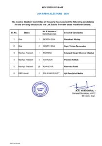 खंडवा में नरेंद्र पटेल का भाजपा के ज्ञानेश्वर पाटिल से मुकाबला है। कांग्रेस ने मुरैना में भाजपा के शिवमंगल सिंह के सामने सत्यपाल सिंह सिकरवार को मैदान में उतारा है। वहीं, ग्वालियर में भाजपा के भारत सिंह कुशवाह के सामने प्रवीण पाठक को टिकट दिया है। कांग्रेस ने अब तक मध्यप्रदेश की 29 सीटों में से 28 पर उम्मीदवारों के नामों का ऐलान कर दिया है। जबकि खजुराहो सीट सपा के लिए छोड़ी गई है।