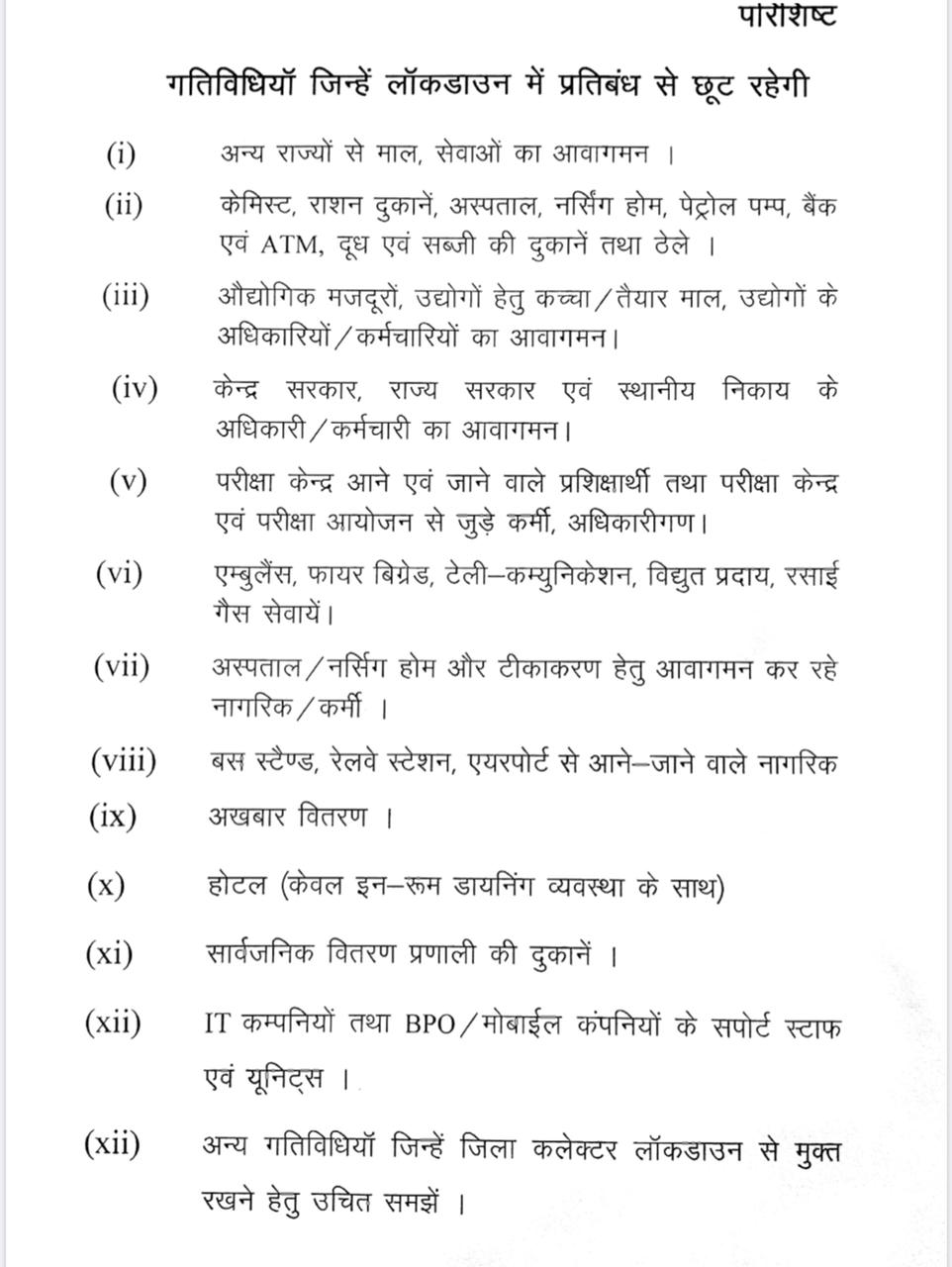 लॉक डाउन के दौरान सुबह 3 घण्टे दूध, राशन, किराना और सब्जी दुकान को छूट रहेगी। वहीं शहरी सीमा के बाहर के कारखाने और फैक्ट्रियों के मजदूरों तथा कर्मचारियों की आवाजाही रहेगी।