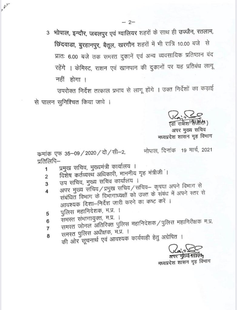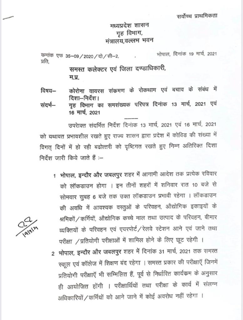कोरोना के बढ़ते प्रकरणों को देखते हुए प्रदेश के इंदौर भोपाल एवं जबलपुर शहरों में शनिवार 20 मार्च रात्रि 10:00 बजे से 22 मार्च सोमवार को प्रातः 6:00 बजे तक लॉकडाउन रहेगा। लॉकडाउन के दौरान आवश्यक सेवाएं तथा उद्योग चालू रहेंगे।