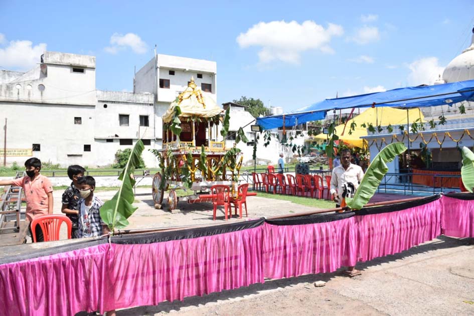 जबलपुर। भगवान जगन्नाथ के भात को जगत पसारे हाथ, आज मंगलवार को भगवान जगन्नाथ की रथ उत्सव कार्यक्रम विधि विधान से मनाया गया। जगदीश मंदिर प्रांगण में ही भगवान जगन्नाथ के रथ को रखा गया, कोरोना काल के कारण नगर में रथ भ्रमण की अनुमति नहीं दी गई। जिससे मंदिर प्रागंण में ही पूरे विधि विधान से भगवान जगन्नाथ का पूजन अर्चन किया गया। उल्लेखनीय है कि दो साल से भगवान जगन्नाथ की रथ यात्रा नगर भ्रमण पर नहीं निकल रहीं है, जिसका कारण कोरोना संक्रमण है। इस वर्ष भी भगवान जगन्नाथ की रथ महोत्सव मंदिर प्रांगण में मनाया जा रहा है। जानकारी अनुसार भगवान जगन्नाथ की 21 दिन की चंदन यात्रा शुरु होती है। इस दौरान स्नान पूर्णिमा को जगन्नाथजी, बालभद्र व सुभद्रा को कलश के पानी से स्नान कराया जाता है। इसके बाद उन्हें एकांत कक्ष में रखा जाता है। उसके अगले 15 दिन तक महाप्रभु को छप्पन भोग न लगाकर फलाहर व औषधियों का भोग लगाया जाता है। आज सोमवार सुबह मंगला आरती के साथ ही विधिपूर्वक रथयात्रा शुरु होती है। इस दौरान मंदिर से निकलने के पहले महाप्रभु को फूलों का मुकुट पहनाया जाता है, जिसे ताहिया कहते है। रथ पर श्रृंगार के साथ महाप्रभु सवार होकर श्रृद्धालुओं को दर्शन देते है। इस संबंध में जगदीश मंदिर के पुजारी देवेन्द्र त्रिपाठी ने बताया कि इस मर्तबा भी कोरोना के कारण भगवान जगन्नाथ की रथ यात्रा नगर में भ्रमण नहीं करेगी। मंदिर प्रांगण में श्रृद्धालू पहुंच रहे है और विधि विधान से पूजन-अर्चन करेंगे। जिसमें पूरी तरह से सोशल डिस्टेसिंग का पालन किया जा रहा है।