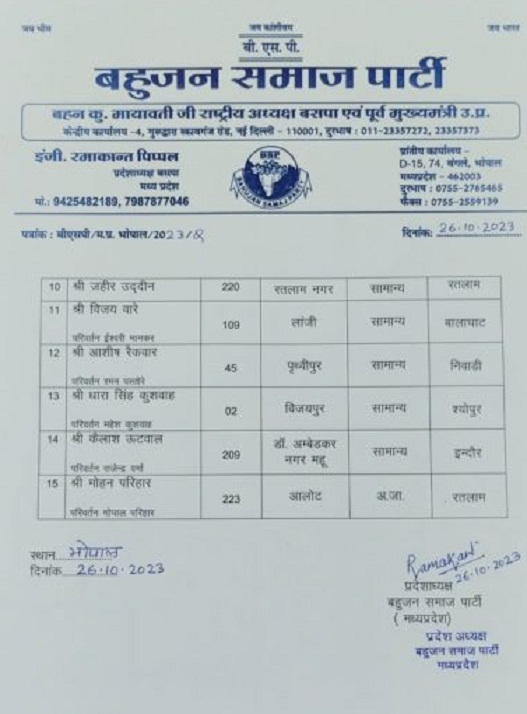 इसके अलावा बसपा ने ग्वालियर दक्षिण से सद्दो खान, डबरा से सत्यप्रकाशी परसेड़िया, मल्हरा से लखन लाल अहिरवार, जयसिंह नगर से रंजीत सिंह, देपालपुर से प्रकाश सोलंकी, इंदौर-2 से ज्ञानेंद्र बगोरिया, इंदौर-3 से राजेंद्र अहिरवाल, रतलाम शहर से जहीर उद्दीन, लांजी से विजय वारे को उम्मीदवार बनाया है।