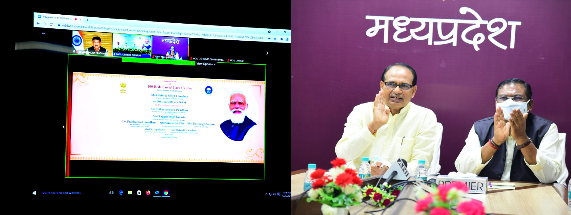 मुख्यमंत्री श्री चौहान ने आज मंडला में मोइल (मैग्नीज ओर इंडिया लिमिटेड) द्वारा निर्मित 100 बिस्तरीय कोविड केयर सेंटर का वर्चुअल लोकार्पण किया। इस अवसर पर केंद्रीय इस्पात राज्य मंत्री श्री फग्गन सिंह कुलस्ते उपस्थित थे। केन्द्रीय इस्पात, पेट्रोलियम और प्राकृतिक गैस मंत्री श्री धर्मेंद्र प्रधान और स्वास्थ्य मंत्री श्री प्रभुराम चौधरी वर्चुअली शामिल हुए।