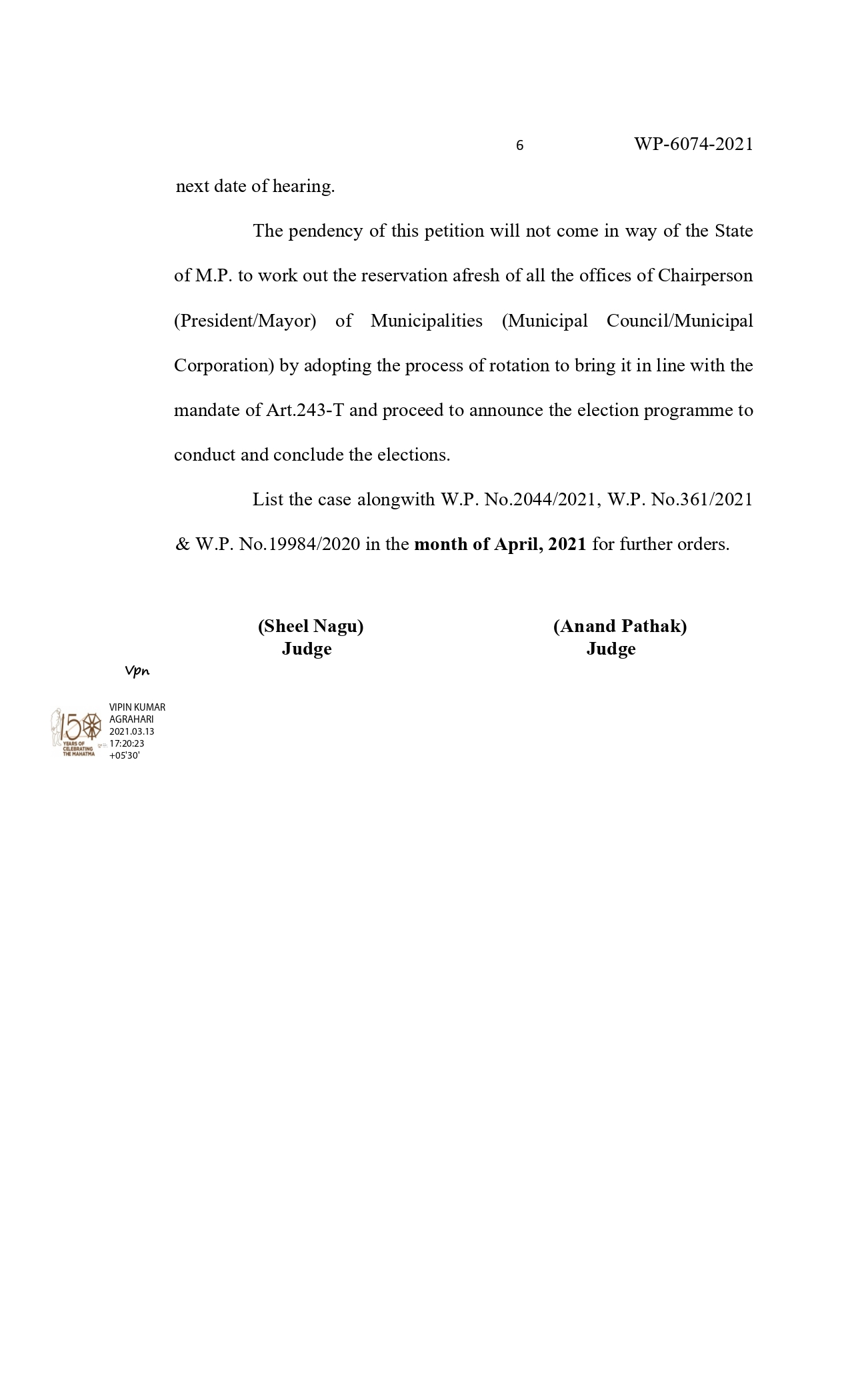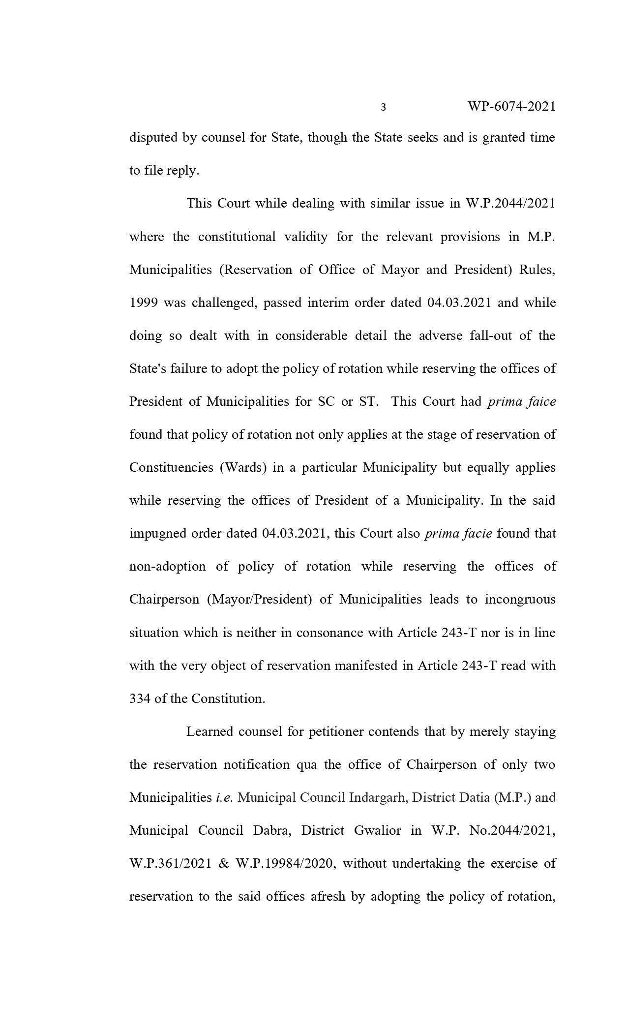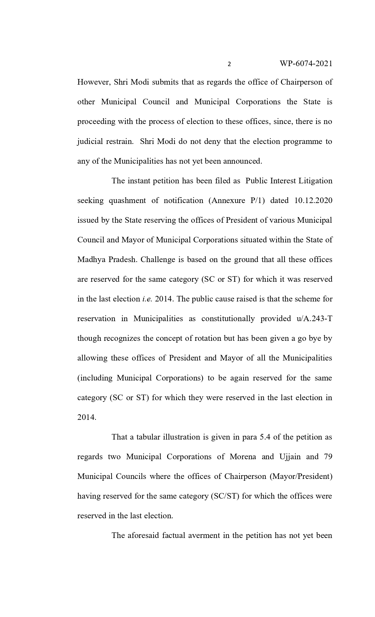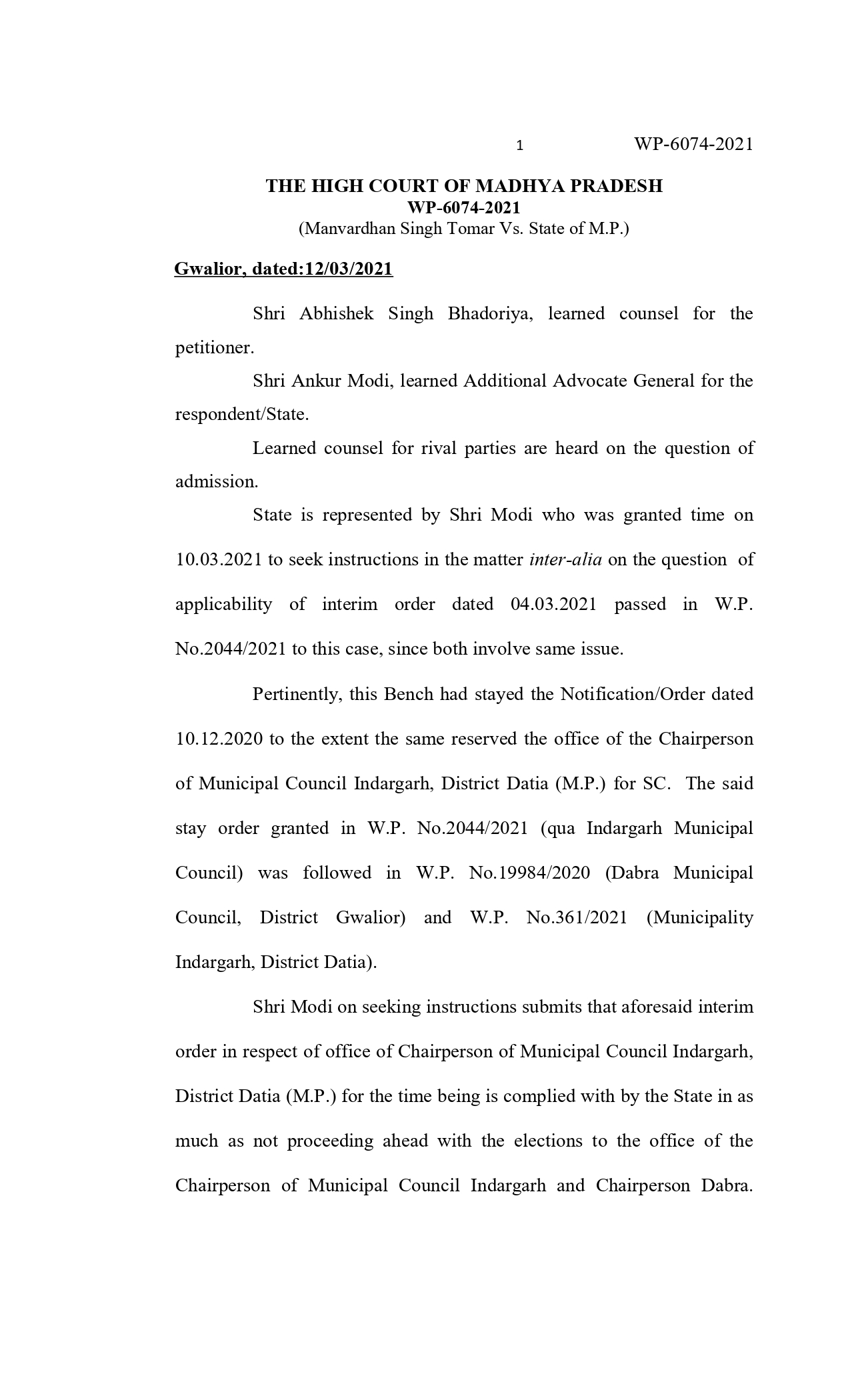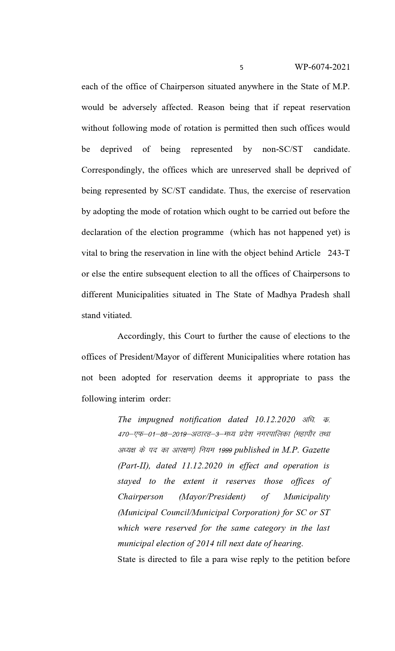 न्यायमूर्ति शील नागू एवं न्यायमूर्ति आनंद पाठक की युगलपीठ ने याचिकाकर्ता मानवर्धन सिंह तोमर याचिका पर सुनवाई करते हुए यह आदेश दिए हैं। इस मामले में शासन की ओर से पैरवी करते हुए अतिरिक्त महाधिवक्ता अंकुर मोदी ने कहा कि शासन द्वारा इस मामले में विस्तृत जवाब प्रस्तुत किया जाएगा। याचिकाकर्ता ने कहा कि नगर परिषद में अध्यक्ष तथा नगर निगम में महापौर पद के लिए आरक्षण में नियमों का पालन नहीं किया गया है। वर्ष 2014 में जो अध्यक्ष एवं महापौर के पद आरक्षित थे उन्हें फिर आरक्षित कर दिया गया है। इस कारण अन्य वर्ग को अध्यक्ष के पद पर प्रतिनिधित्व से वंचित किया जा रहा है। जो कि संविधान की मूल भावना के विपरीत है। इससे पहले इंदरगढ, दतिया तथा डबरा में नगर पालिका अध्यक्ष एवं नगर परिषद अध्यक्ष के आरक्षण में नियमों का पालन नहीं होने पर हाईकोर्ट द्वारा रोक लगाई जा चुकी है। याचिकाकर्ता का कहना था कि इस मामले में आरक्षण में रोटेशन का पालन नहीं किया गया है। इसलिए शासन द्वारा किए गए आरक्षण को निरस्त कर नियमानुसार आरक्षण किए जाने के निर्देश शासन को दिए जाएं। अतिरिक्त महाधिवक्ता द्वारा न्यायालय को बताया गया कि अभी तक किसी भी नगर पालिका या नगर निगम के चुनाव की घोषणा नहीं की गई है। न्यायालय ने पाया कि शासन द्वारा आरक्षण की प्रक्रिया का पालन नहीं किया गया है इससे वे लोग प्रभावित होंगे जिन्हें इसका लाभ मिलना चाहिए था, लिहाजा आरक्षण पर रोक लगा दी गई है।
