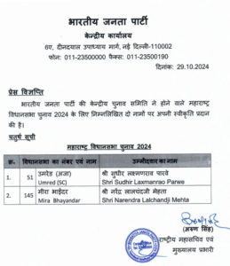 महाराष्ट्र चुनाव : भाजपा की चौथी लिस्ट जारी, मीरा भयंदर से नरेंद्र मेहता को टिकट