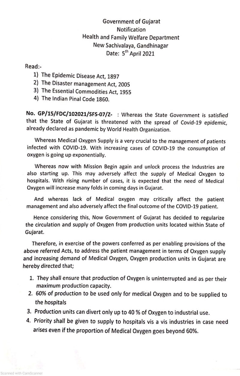 सरकार (Government) ने सिर्फ अस्पतालों (Hospitals) को ही ऑक्सीजन (Oxygen) देने के आदेश जारी किए है इस दौरान एक बड़ी परेशानी पर्याप्त ऑक्सीजन सप्लाय (Oxygen Supply) की इसलिए भी आ रही है क्योंकि महाराष्ट्र (Maharashtra) और गुजरात सरकार (Gujrat Government) ने अपने राज्यों के ऑक्सीजन प्लांट (Oxygen Plant) संचालकों को यह निर्देश दिए हैं कि वह बाहरी राज्यों को लिक्विड ऑक्सीजन सप्लाई (Oxygen Supply) ना करें और 80 फ़ीसदी ऑक्सीजन (Oxygen) खुद अपने ही राज्यों के ही अस्पतालों (Hospitals) को दी जाए और शेष 20% ऑक्सीजन इंडस्ट्रीज (Oxygen Industry) या अन्य उपयोग में इस्तेमाल की जाए ।
