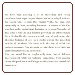 रिलायंस एंटरटेनमेंट ने जारी किए अपने बयान में कहा है, ‘हम देख रहे हैं कि फिल्म ‘विक्रम वेधा’ की शूटिंग लोकेशंस को लेकर कुछ बिलकुल निराधार खबरें सामने आ रही हैं. हम साफ कर देना चाहते हैं कि विक्रम वेधा की शूटिंग लखनऊ समेत पूरे देश में हुई है. अक्टूबर-नवंबर 2021 में इस फिल्म का कुछ हिस्सा यूएई में भी फिल्माया गया है था, क्योंकि यही ऐसी लोकेशन थी जो हमें इतने बड़े क्रू को ध्यान में रखते हुए बायो-बबल बनाने की व्यवस्था कर पाई थी. साथ ही शूटिंग के लिए स्टूडियों में सेट्स बनाने की इजाजत भी हमें यहां मिल पा रही थी. ऐसे में स्वास्थ्य संबंधी नियमों को ध्यान में रखते हुए हमने ये कदम उठाया था. इन तथ्यों को तोड़-मरोड़कर अगर कोई भी पेश कर रहा है तो वह सिर्फ गलत मंशाओं से कर रहा है.’