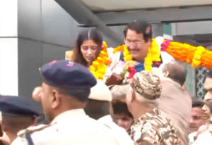 नई दिल्ली. भारत (India) की डबल मेडल विजेता निशानेबाज (Double medal winning shooter) मनु भाकर (Manu Bhaker) पेरिस ओलंपिक (paris olympics) में ऐतिहासिक प्रदर्शन के बाद आज (7 अगस्त) वापस स्वदेश . वह दिल्ली के इंदिरा गांधी इंटरनेशनल एयरपोर्ट पर आईं जहां उनका जोरदार स्वागत (warm welcome) हुआ. टर्मिनल 3 के वीआईपी गेट से बाहर निकलने के बाद उनका जोरदार स्वागत हुआ, इस दौरान उनके कोच जसपाल राणा (Coach Jaspal Rana) भी नजर आए. दोनों की फूल मालाओं में फैन्स ने लाद दिया.