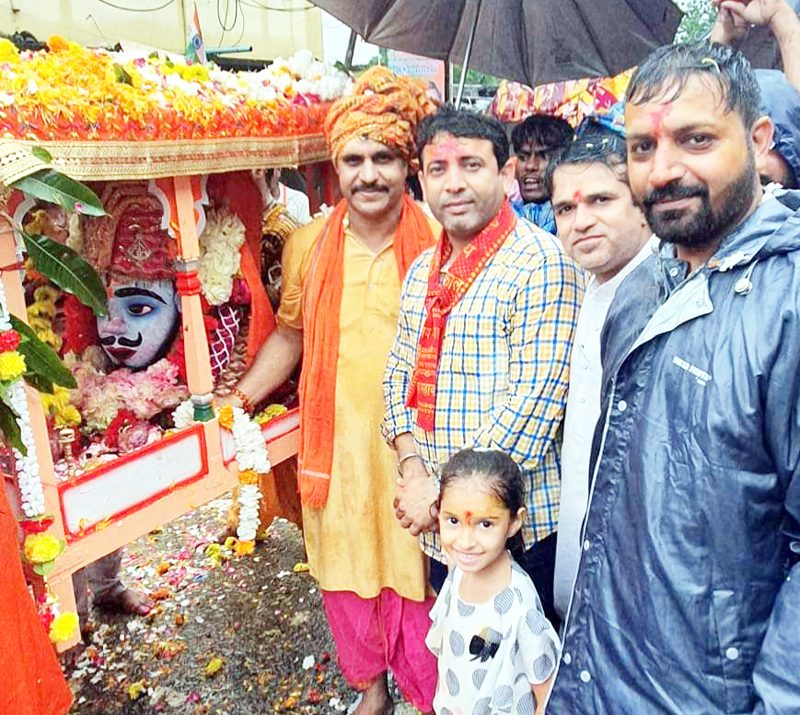 सोमवार को ग्राम धुलेट स्थित मंदिर में भगवान श्री धुर्जटेश्वर महादेव के पूजन के बाद नगर के चौपड़ा हनुमान मंदिर पर पहुंची। जहाँ पूजन आरती पश्चात बाबा की शाही सवारी अपने पूरे लाव लश्कर के साथ शुरू हुई जिसमें सबसे आगे ऊंट, हाथी पर बाबा का चित्र शामिल था, वहीं कड़ाबीन की तेज आवाज के साथ बाबा की अगवानी की जा रही थी। इसी के साथ नासिक के ढोल, शिव भक्तों की ताशा पार्टी, घोड़ा बग्गी, नाचने वाली घोड़ी, बडऩगर का बैंड, ढोल भी शामिल हुए। इतना ही नहीं नगर व अंचल के विभिन्न अखाड़ों के पहलवान हैरतअंगेज करतब दिखा रहे थे। कोटा से आए सदस्य भोलेनाथ व गणों के स्वरूप में नृत्य करते हुए उत्साह के साथ सवारी की शोभा बढ़ा रहे थे। दो पंचेड़ मशीनों से चारों ओर पुष्प उड़ाए जा रहे थे जिससे शाही सवारी में चार चांद लग गए। सुबह से तेज तो कभी रिमझिम बारिश का सिलसिला चलता रहा। इसके बावजूद भक्तों का उत्साह देखते ही बन रहा था।