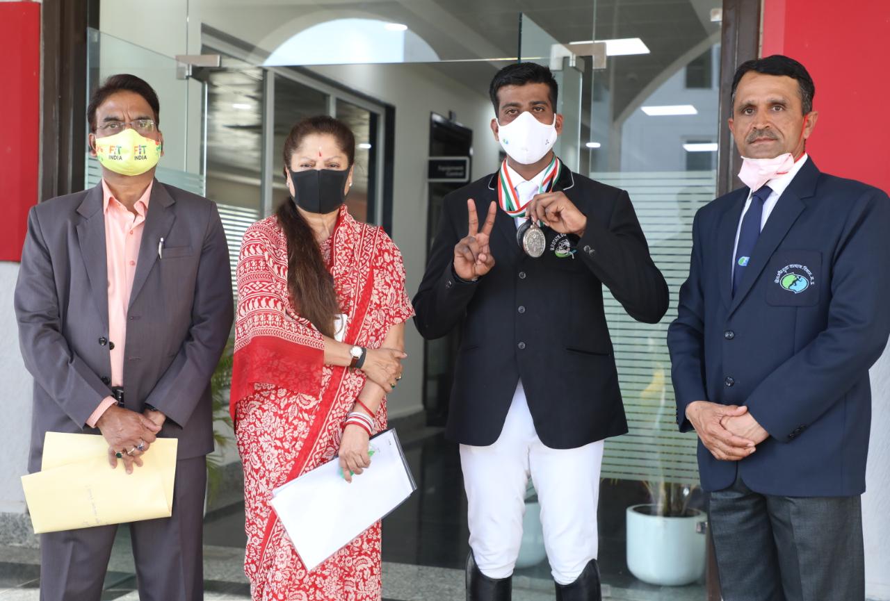 भोपाल। अंतर्राष्ट्रीय एवं राष्ट्रीय घुड़सवारी प्रतियोगिता के पदक विजेता खिलाड़ियों ने गत दिवस खेल और युवा कल्याण मंत्री मान. यशोधरा राजे सिंधिया से सौजन्य भेंट की। इस अवसर पर संचालक खेल और युवा कल्याण पवन जैन एवं घुड़सवारी अकादमी के मुख्य प्रशिक्षक कैप्टन भागीरथ तथा सहायक प्रशिक्षक कैप्टन ए.के. शुक्ला उपस्थित थे।