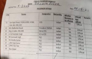 हेलिकॉप्टर में सीडीएस बिपिन रावत के साथ उनकी पत्नी मधुलिका रावत, ब्रिगेडियर एल.एस. लिद्दर, लेफ्टिनेंट कर्नल हरजिंदर सिंह, नायक गुरसेवक सिंह, नायक जितेंद्र कुमार, नायक विवेक कुमार, नायक बी. साई तेजा, हवलदार सतपाल और पायलट सवार थे। जनरल रावत की उपस्थिति की पुष्टि करते हुए, भारतीय वायु सेना ने ट्वीट किया, “एक आईएएफ एमआई-17वी5 हेलीकॉप्टर, जिसमें सीडीएस जनरल बिपिन रावत सवार थे। आज तमिलनाडु के कुन्नूर के पास दुर्घटनाग्रस्त हो गया।” आर्मी ने कहा कि दुर्घटना के कारणों का पता लगाने के लिए जांच के आदेश दे दिए गए हैं।