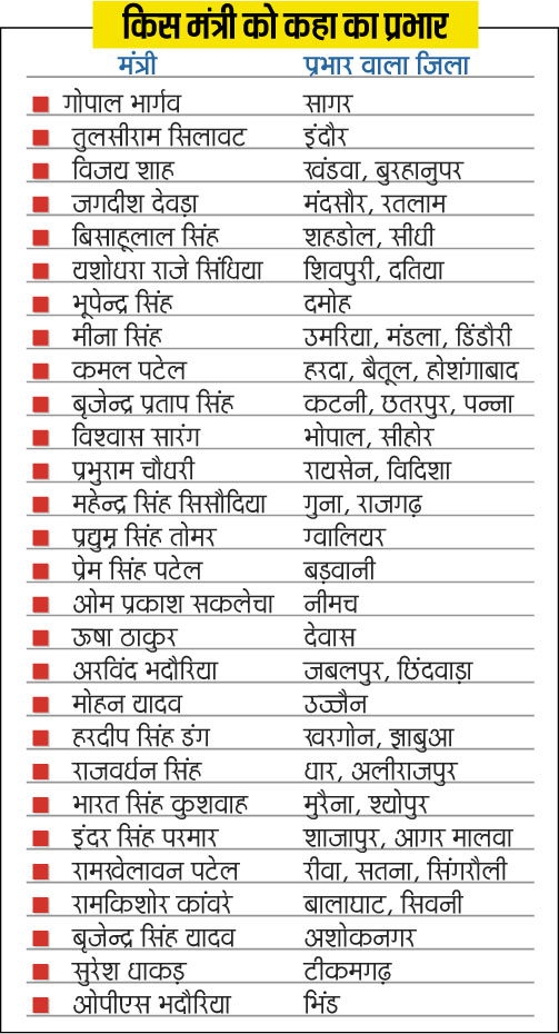 भोपाल। मुख्यमंत्री शिवराज सिंह चौहान (Chief Minister Shivraj Singh Chauhan) ने प्रदेश में कोरोना से निपटने के लिए मंत्रियों को जिलों का प्रभार सौंप दिया है। ज्यादातर मंत्रियों को गृह जिले या आसपास के जिलों प्रभार सौंपा गया है। विश्वास सारंग (Vishwash Sarang) को भोपाल, तुलसीराम सिलावट (Tulsiram Silawat) इंदौर, प्रद्युम्र तोमर (Praduman Tomar) ग्वालियर, अरविंद भदौरिया (Arvind Bhadoriya) को जबलपुर का प्रभार सौंपा गया है। गृह मंत्री नरोत्तम मिश्रा (Narottam Mishra) को प्रदेश से बाहर होने की वजह से अभी प्रभार नहीं दिया है। साथ ही मंत्री गोविंद सिंह राजपूत (Govind Singh Rajput) बीमार हैं। इस वजह से उन्हें भी किसी जिले का प्रभार नहीं मिला है। भूपेन्द्र सिंह विधानसभा (Vidhan Sabha) उपचुनाव के लिए दमोह के प्रभारी हैं। उन्हें दमोह (Damoh) जिले का प्रभार सौंपा गया है। मुख्यमंत्री (Chief Minister) ने आज सुबह मंत्रियों की विशेष बैठक बुलाकर मंत्रियों को जिलों के प्रभार सौंपे हैं। प्रभार वाले जिलों में मंत्री कोरोना संक्रमित मरीजों के उपचार की निगरानी करेंगे। सीसीसी (कोविड केयर सेंटर)के संचालन, औषधियों की आपूर्ति, ऑक्सीजन आपूर्ति, जनजागरुकता का काम संभालेंगे।