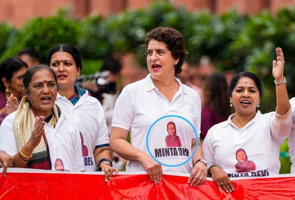 गौरतलब है कि मंगलवार को इंडिया गठबंधन के कई सांसदों ने संसद परिसर में बिहार में निर्वाचन आयोग की मतदाता सूची पुनरीक्षण प्रक्रिया के खिलाफ प्रदर्शन किया। प्रियंका गांधी सहित कई सांसद सफेद टी-शर्ट पहने नजर आए, जिस पर ‘मिंता देवी’ और उनकी तस्वीर छपी थी और पीछे ‘124 नॉट आउट’ लिखा था। उन्होंने प्रदर्शन में भाग लेते हुए आरोप लगाया कि मिंता देवी को पहली बार की मतदाता दिखाया गया है जबकि उनकी उम्र 124 साल है। मतदाता सूची में उनका नाम पहली बार मतदाता के रूप में दर्ज है। हम ऐसे मुद्दों पर चर्चा चाहते हैं।