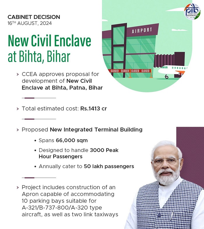 कैबिनेट के फैसलों के मुताबिक बिहटा में एक नए सिविल एन्क्लेव का निर्माण किया जाएगा. इस एयरपोर्ट को A-321/B-737-800/A-320 प्रकार के विमानों के परिचालन के अनुरूप बनाया जाएगा. एयरपोर्ट पर 10 पार्किंग बे भी बनाया जाएगा और एप्रन का भी निर्माण किया जाएगा. बिहटा में साल 2026 तक 1413 करोड़ की मदद से यह नया एयरपोर्ट बनकर तैयार होगा.