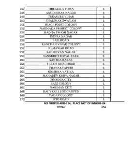 इंदौर। शहर के कुछ बड़े इलाकों में लगातार कोरोना का संक्रमण फैलता जा रहा है, जिसमें प्रमुख रूप से विजय नगर, सुखलिया, सुदामा नगर, स्नेहलता गंज, खजराना, मुसाखेड़ी, सिलीकॉन सिटी शामिल है। इन इलाकों से लगातार सर्वाधिक संक्रमित मरीज मिल रहे है। जिले में 270 क्षेत्रों से कुल 656 संक्रमित मरीज मिले है।