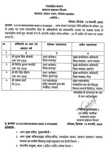 भिंड के मुख्य कार्यपालन अधिकारी सुनील दुबे को राज्यपाल का उप सचिव बनाया गया है। उच्च शिक्षा विभाग की उपसचिव संघमित्रा गौतम को आलीराजपुर जिले का मुख्य कार्यपालन अधिकारी नियुक्त किया गया है।