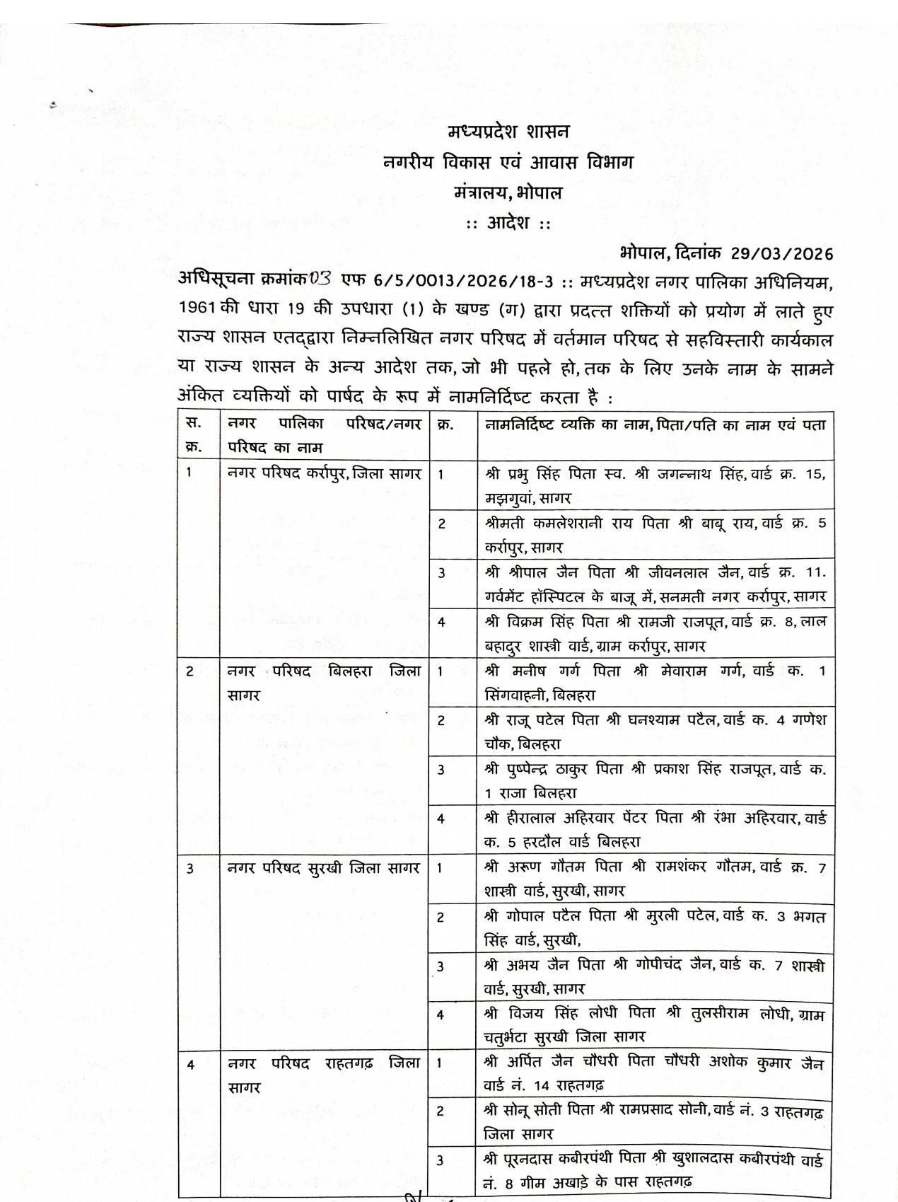नगरीय विकास और आवास विभाग द्वारा जारी अधिसूचना के अनुसार, ये नियुक्तियां मध्यप्रदेश नगर पालिका अधिनियम, 1961 की धारा 19 (1) (ग) के तहत की गई हैं. आदेश में स्पष्ट किया गया है कि इन मनोनीत पार्षदों का कार्यकाल संबंधित नगर परिषद के मौजूदा कार्यकाल के साथ समाप्त होगा या शासन के आगामी आदेश तक प्रभावी रहेगा. एल्डरमैन के नामों की घोषणा नगरीय निकायों की सबसे शुरुआती इकाई यानी नगर परिषद स्तर से शुरू की गई है.