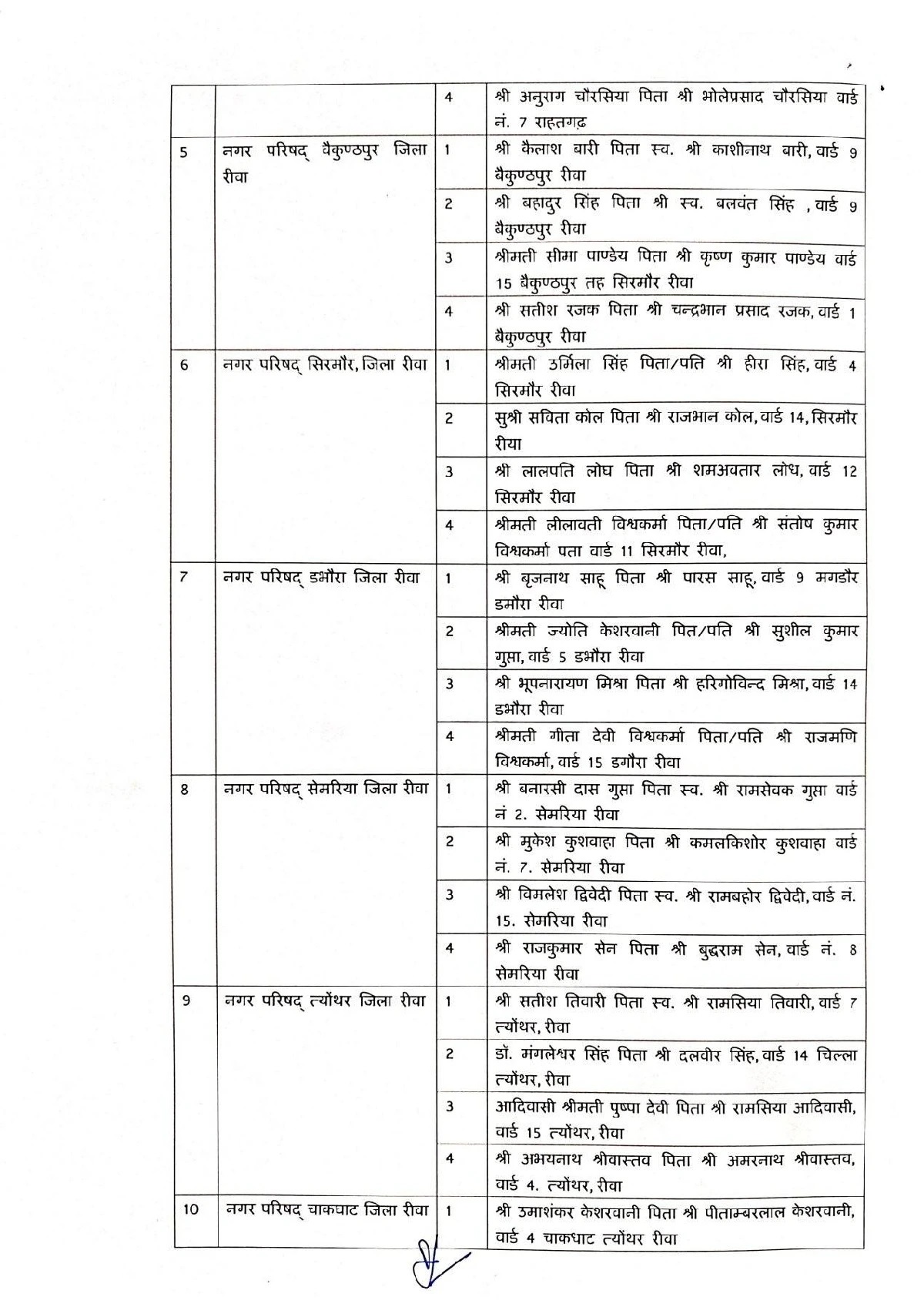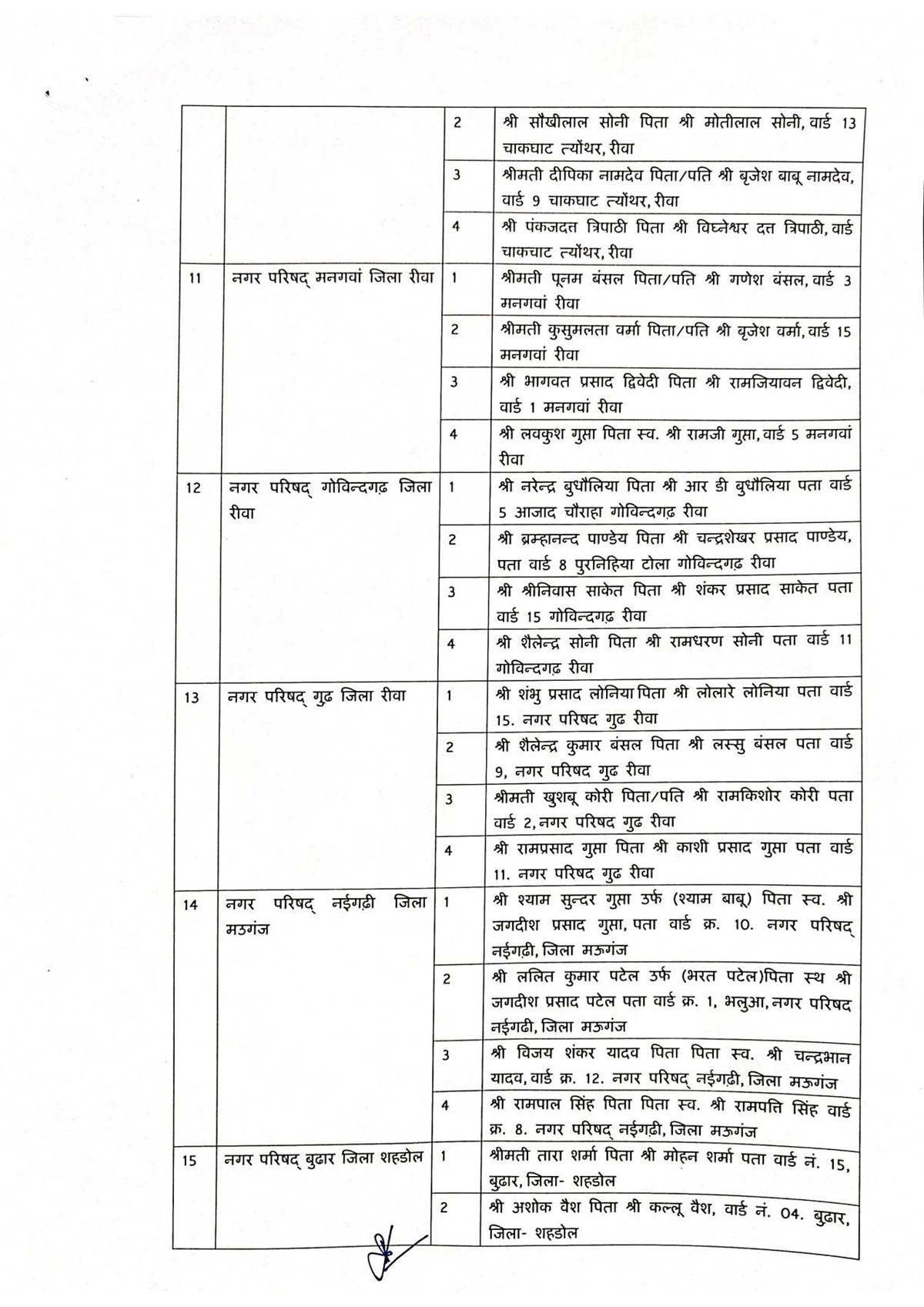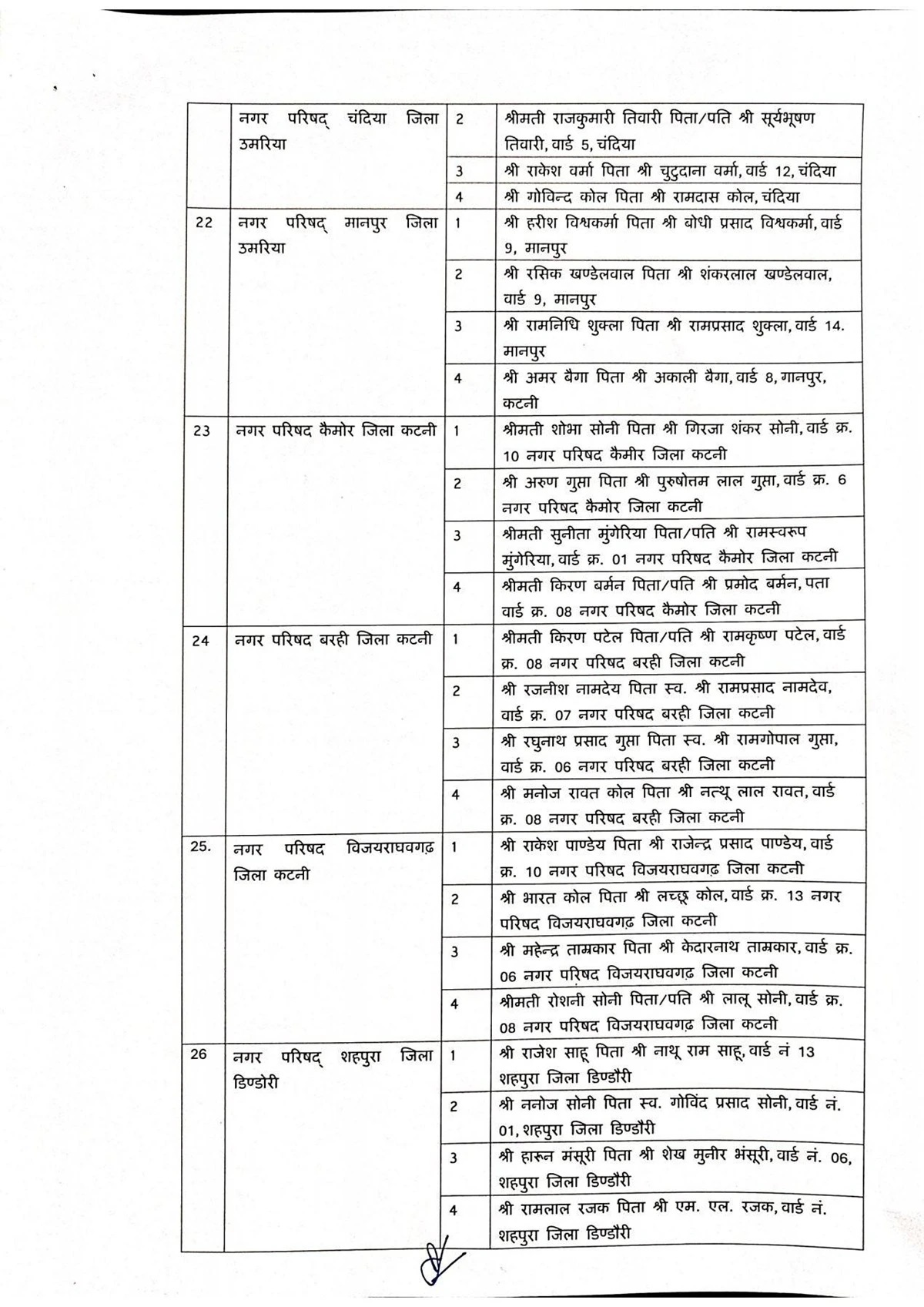 जिन जिलों की नगर परिषदों में एल्डरमैन नियुक्त किए गए हैं, उनमें सागर, रीवा, मऊगंज, शहडोल, उमरिया, कटनी, डिंडोरी, नरसिंहपुर, बालाघाट, सिवनी, छिंदवाड़ा, पांढुर्णा, नर्मदापुरम, हरदा, बैतूल, बुरहानपुर, खरगोन, बड़वानी, अलीराजपुर, झाबुआ, धार, देवास, रतलाम, मंदसौर और नीमच शामिल है. इन सभी नगर परिषदों में अधिकतम चार-चार एल्डरमैन नियुक्त किए गए हैं।
