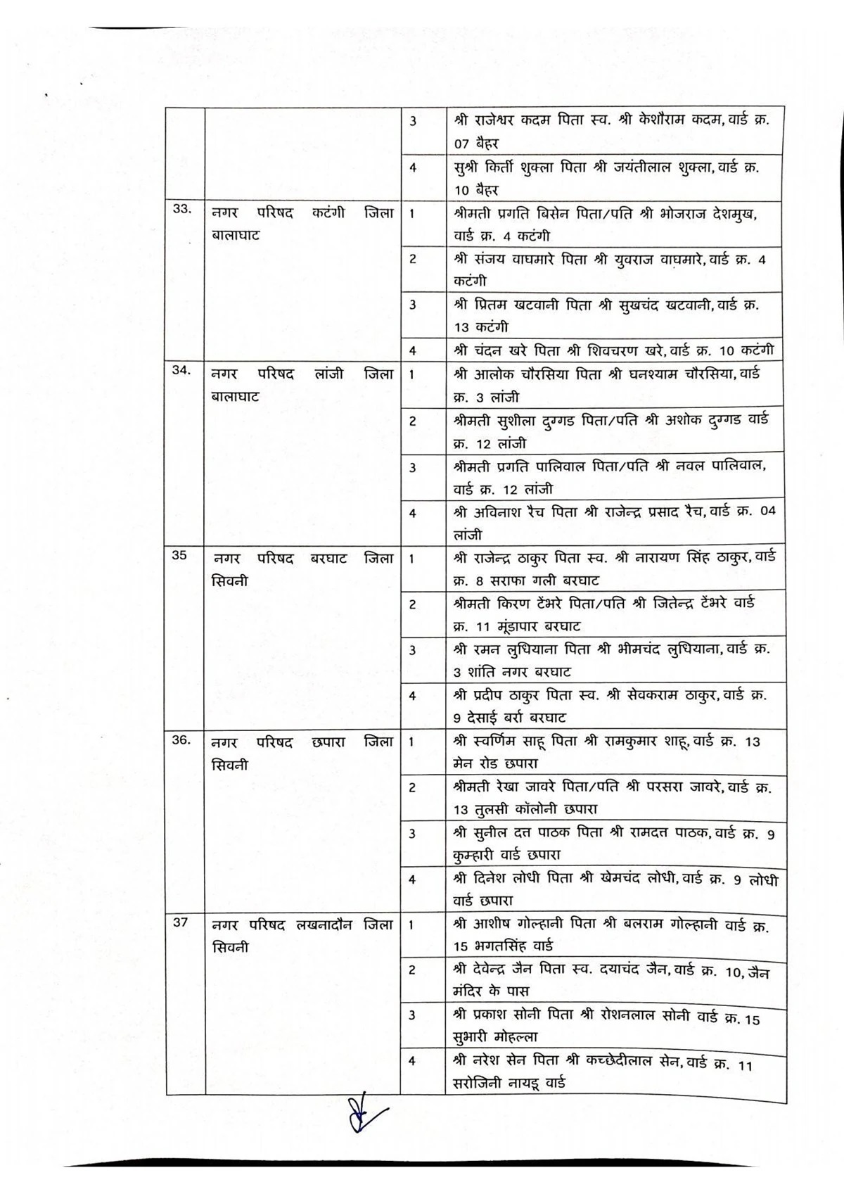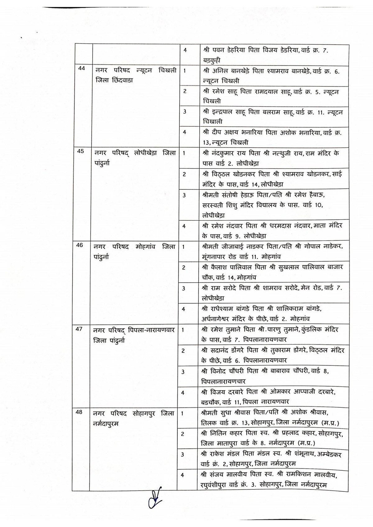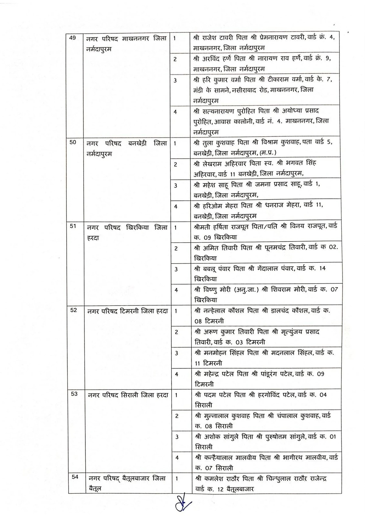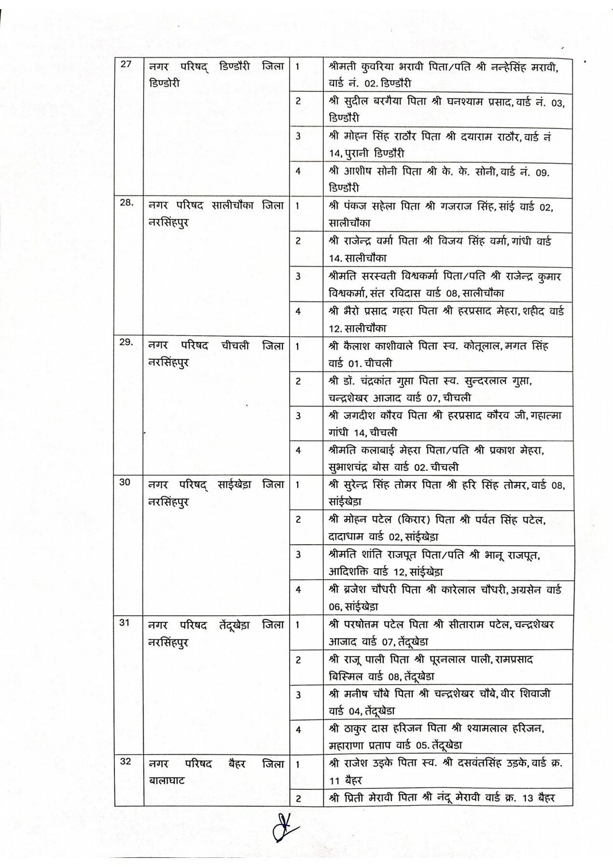 जिन जिलों की नगर परिषदों में एल्डरमैन नियुक्त किए गए हैं, उनमें सागर, रीवा, मऊगंज, शहडोल, उमरिया, कटनी, डिंडोरी, नरसिंहपुर, बालाघाट, सिवनी, छिंदवाड़ा, पांढुर्णा, नर्मदापुरम, हरदा, बैतूल, बुरहानपुर, खरगोन, बड़वानी, अलीराजपुर, झाबुआ, धार, देवास, रतलाम, मंदसौर और नीमच शामिल है. इन सभी नगर परिषदों में अधिकतम चार-चार एल्डरमैन नियुक्त किए गए हैं।
