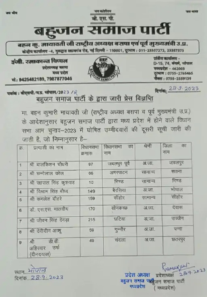 जारी सूची के अनुसार, बसपा ने जबलपुर पूर्व से बालकिशन चौधरी, अमरपाटन से छन्गे लाल कोल, भिंड से रक्षपाल सिंह कुशवाह, बैरसिया से विश्राम सिंह बौद्ध, सीहोर से कमलेश दोहरे, सोनकच्छ से डॉ. एसएस मालवीय, घट्टिया से जीवन सिंह देवड़ा, गुन्नौर से देवीदीन आशु और चंदला से दीनदयाल (डीडी) अहिरवार को उम्मीदवार बनाया है।