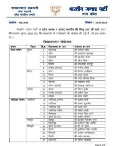 भाजपा के प्रदेशाध्यक्ष एवं सांसद वीडी शर्मा की सहमति से विधानसभा संयोजकों की घोषणा की गई है। बता दें कि 10 संभाग की 230 विधानसभा के लिए विधानसभा संयोजकों की घोषणा की गई है। इन नियुक्तियों में सभी वर्गों को साधने का ख्याल रखा गया है। वहीं विधानसभा चुनाव के लिए अपने संगठन को मजबूत करने के लिए बीजेपी ने यह घोषणा की है।