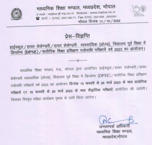 माध्यमिक शिक्षा मंडल के जनसंपर्क अधिकारी के हस्ताक्षर से जारी पत्र में बताया गया है कि हाईस्कूल, हायर सेकेंडरी व्यवसायिक (ओल्ड), विद्यालय पूर्व शिक्षा में डिप्लोमा, शारीरिक शिक्षा प्रशिक्षण पत्रोपाधि परीक्षाओं का आयोजन किया जाएगा। 13 फरवरी से 25 मार्च 203 के मध्य प्रायोगिक परीक्षाएं एवं 15 फरवरी से 20 मार्च 2023 के मध्य सैद्धांतिक परीक्षाएं आयोजित की जाएगी। इनका विस्तृत परीक्षा कार्यक्रम अलग से जारी किया जाएगा।