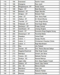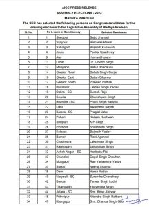 भोपाल में नरेला सीट पर भाजपा के विश्वास सारंग के सामने मनोज शुक्ला को प्रत्याशी बनाया है। मध्य सीट पर मौजूदा विधायक आरिफ मसूद को टिकट दिया गया है। बैरसिया में पिछला चुनाव हारीं जयश्री हरिकरण को फिर से प्रत्याशी बनाया गया है।