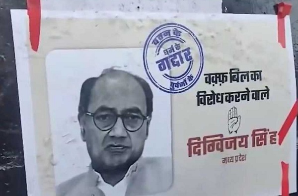 दरअसल दिग्विजय सिंह के खिलाफ जो पोस्टर लगाए हैं, उनमें छपा है – ‘वक्फ बिल का विरोध करने वाले दिग्विजय सिंह’। पोस्टर में दिग्विजय सिंह की तस्वीर पर एक सील से ठप्पा भी लगाया गया है जिस पर छपा है- ‘वतन के, धर्म के, पूर्वजों के गद्दार।’ इंदौर में लगे इन पोस्टर के नीचे छपवाने वाले के रूप में ‘भारतीय जनता युवा मोर्चा, इंदौर महानगर’ का नाम छपा है। जबकि भोपाल में छापने वाले के बारे में नहीं लिखा गया है।
