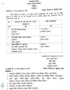 भोपाल। मध्य प्रदेश (Madhya Pradesh) की मोहन यादव (Mohan Yadav) सरकार ने राज्य में प्रशासनिक फेरबदल (Administrative Reshuffle) किया है. यहां तीन आईएएस (IAS) अधिकारियों के तबादले किए गए हैं. साथ ही दो जिलों के कलेक्टरों (Collectors) को भी बदला गया है. मंदसौर और कटनी कलेक्टर को मोहन यादव सरकार ने बदला है. वहीं प्रदेश की सरकार ने दिलीप कुमार यादव को कटनी कलेक्टर बनाया है जबकि अदिति गर्ग को मंदसौर कलेक्टर बनाया गया है. इसके अलावा अवि प्रसाद को उप सचिव बनाया गया है.