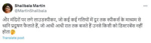 दरअसल, शैलबाला मार्टिन ने X पर लिखा है कि मंदिरों पर लगे लाउडस्पीकर कई गलियों दूर तक स्पीकर्स के जरिए ध्वनि प्रदूषण फैलाते हैं. उन्होंने सवाल उठाया कि ये स्पीकर्स आधी-आधी रात तक बजते हैं, उनसे किसी को डिस्टरबेंस नहीं होता. उन्होंने यह पोस्ट एक दूसरी पोस्ट को रीपोस्ट करते हुए लिखी थी, जिसके बाद हिंदूवादी संगठन संस्कृति बचाव मंच ने इसपर नाराजगी जताई.