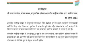 कांग्रेस के वरिष्ठ ने नेता जयराम रमेश ने जारी किया लेटर