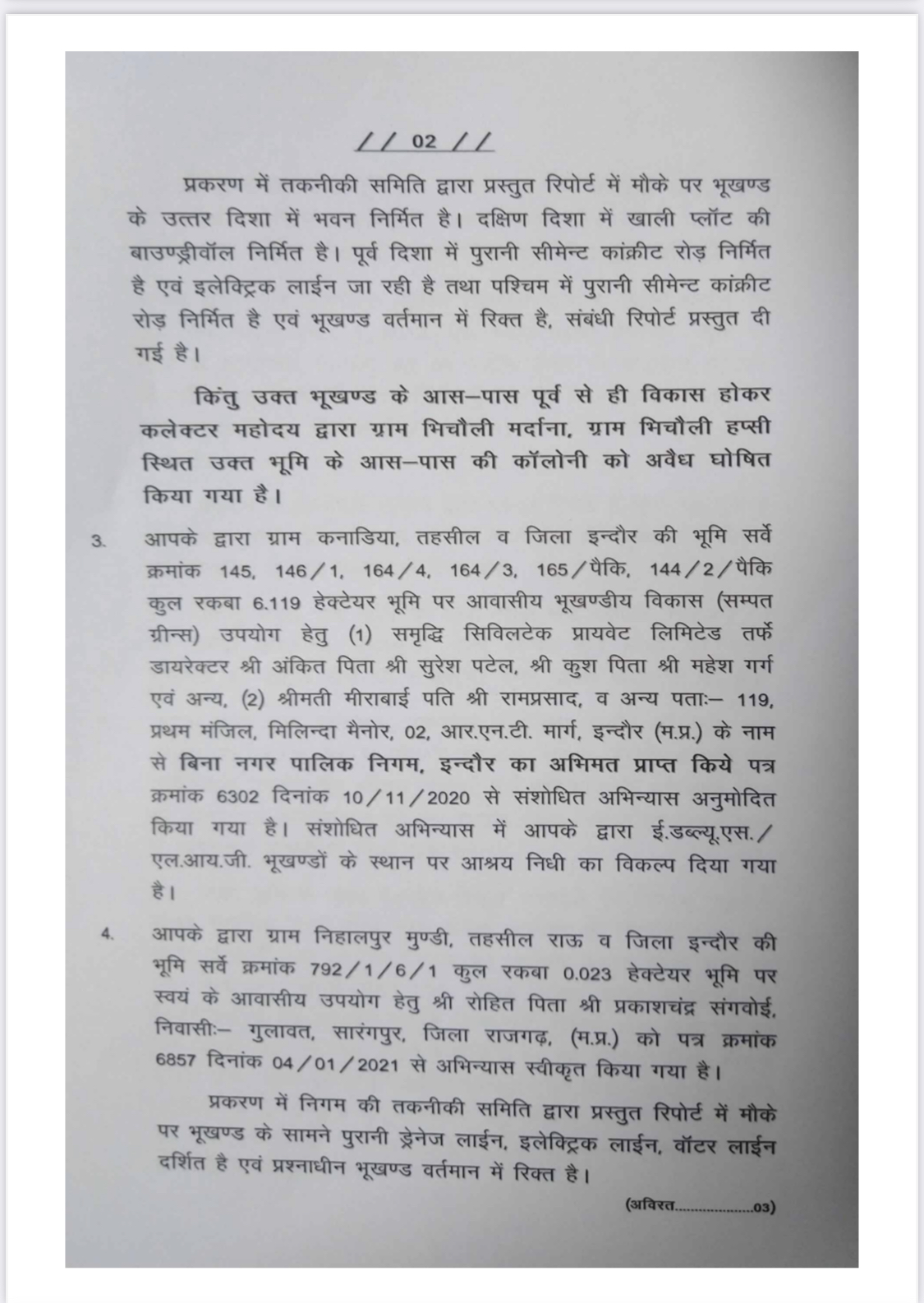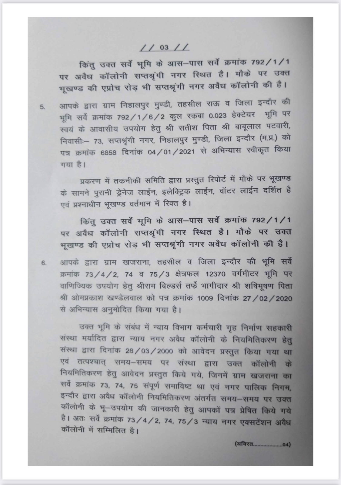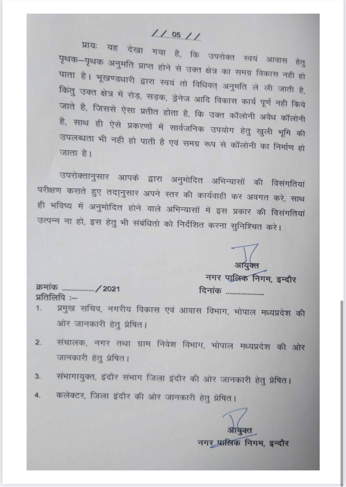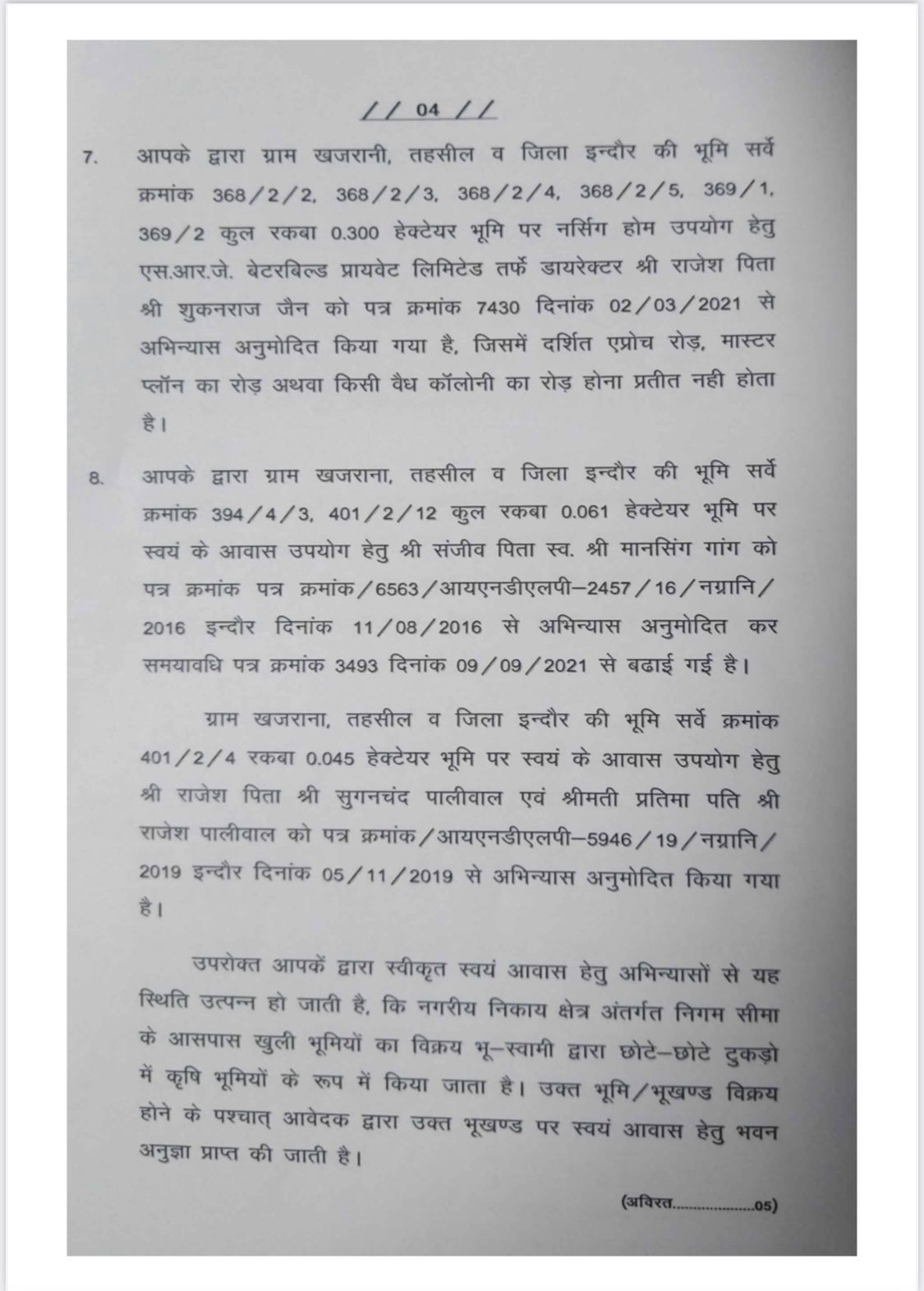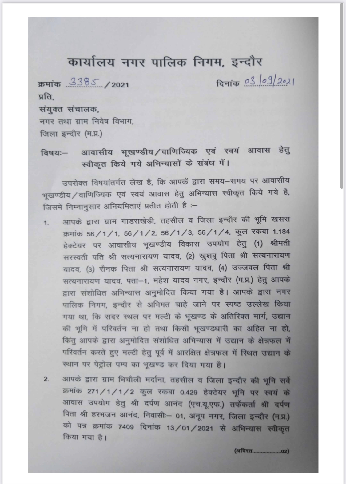 अब निगमायुक्त ने एक और कदम उठाते हुए नगर तथा ग्राम निवेश द्वारा मंजूर कई अभिन्यासों में अनियमितताएं (Irregularities) पकड़ी है। ऐसे 8 मंजूर अभिन्यासों के उदाहरण देते हुए आयुक्त ने नगर तथा ग्राम निवेश को पत्र लिखा है कि इन अभिन्यासों की जांच करें .ये अभिन्यास गाडरा खेड़ी , भिचोली मर्दाना, कनाडिया , भिचोली हप्सी , निहालपुर मुंडी और खजराना क्षेत्र में स्वयं के आवासों से लेकर बहुमंजिला इमारतों ,नर्सिंग होम(Nursing home) ,पेट्रोल पंप (Petrol Pump) और अन्य उपयोग के लिए मंजूर किए गए हैं। इसमें गाडराखेड़ी के मंजूर अभिन्यास में मल्टी के आरक्षित क्षेत्रफल में संशोधन के बाद उद्यान के स्थान पर पेट्रोल पंप का भूखंड मंजूर किया गया . इसी तरह भिचोली मर्दाना में दर्पण आनंद को स्वयं के आवास की अनुमति दी गई है। जबकि कलेक्टर इसके आसपास की कॉलोनियों , जिनमें प्रगति विहार भी शामिल है , को पूर्व में अवैध घोषित कर चुके हैं , ऐसी कालोनियां (Colonies) भिचोली मर्दाना के साथ बिचोली हप्सी में भी है। इसके साथ ही कनाडिया में भी मंजूर अभिन्यास के अलावा निहालपुर मुंडी में अवैध सप्तश्रृंगी नगर के आसपास भी अभिन्यास मंजूर किए गए तो न्याय विभाग कर्मचारी गृह निर्माण की जमीन श्रीराम बिल्डर (Shriram Builder) के पास गई और उसमें भी अभिन्यास मंजूर हुए हैं . हालांकि भवन अनुज्ञा की अनुमति नगर निगम ने ही दी थी जिसे पिछले दिनों निगमायुक्त ने रिवोक किया है। इसी तरह खजराना में एक नर्सिंग होम को भी अनुमति दी गई जो एसआरजे बिल्डवेल के राजेश जैन का है और उसकी एप्रोच रोड को लेकर स्थिति स्पष्ट नहीं है कि यह रोड मास्टर प्लान की है अथवा वैध कालोनी की। इस तरह की तमाम विसंगतियों के उदाहरण देकर निगमायुक्त ने संयुक्त संचालक नगर तथा ग्राम निवेश से कहा है कि वह इन अभिन्यासों की जांच करवाएं और आगे से मंजूर किए जाने वाले अभिन्यासों में इस तरह की विसंगतियां रोके हालांकि इस बारे में पूछने पर संयुक्त संचालक एस के मुदगल ने कहा कि अभी उन्होंने निगम आयुक्त का पत्र देखा नहीं है और संबंधित प्रकरणों की फाइलें देख कर ही वस्तुस्थिति बता सकेंगे। वैसे श्री मुदगल के मुताबिक नियमों के तहत ही अभिन्यास मंजूर किए जाते हैं और पूर्व में भी कई अभिन्यासों को निरस्त भी किया गया जिनमें तथ्यों को छुपाकर मंजूरी ली गई।