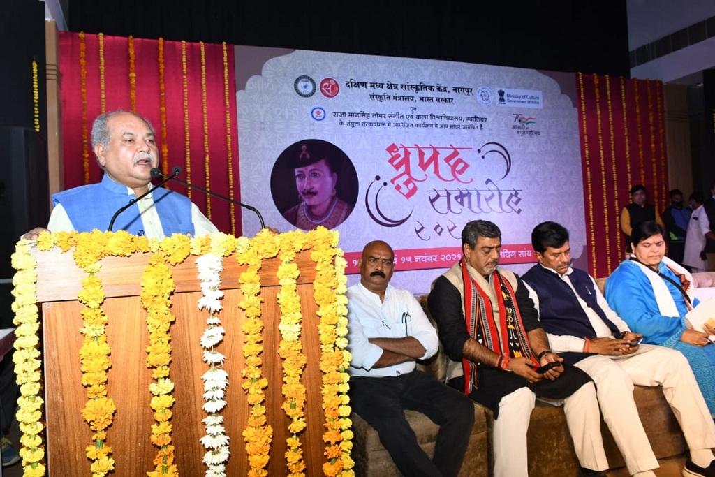 ग्वालियर। केन्द्रीय कृषि एवं किसान कल्याण मंत्री नरेन्द्र सिंह तोमर (Union Minister of Agriculture and Farmers Welfare Narendra Singh Tomar) ने कहा कि राष्ट्रीय ध्रुपद समारोह (National Dhrupad Festival) अब ग्वालियर में प्रतिवर्ष आयोजित किया जाएगा। इसके साथ विख्यात संगीतज्ञ बैजू बाबरा की याद में भी ग्वालियर में कार्यक्रम का आयोजन होगा। केन्द्रीय मंत्री तोमर ने यह बात शनिवार शाम को ग्वालियर के महाराज बाडा स्थित टाउन हॉल में दक्षिण मध्य क्षेत्र सांस्कृतिक केन्द्र नागपुर संस्कृति मंत्रालय भारत सरकार एवं राजा मानसिंह तोमर संगीत एवं कला विश्वविद्यालय ग्वालियर के संयुक्त तत्वावधान में आयोजित तीन दिवसीय ध्रुपद समारोह 2021 के शुभारंभ अवसर पर कही।